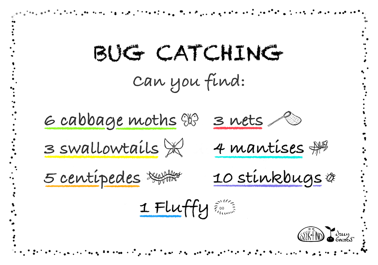 Update 2.5.2026 - A BUG was found in Bug Catching! There were 6 cabbage moths, not 10. Both the postcard and answer key have been corrected. Anyone who purchased this postcard from me at an event in 2025, please let me know at our next event or with a shop order, and I will give you a free replacement postcard. We triple check these and missed by a mile! THANK YOU to the awesome 9 year old who found it for me! <3 - Best, Erica