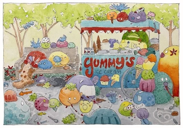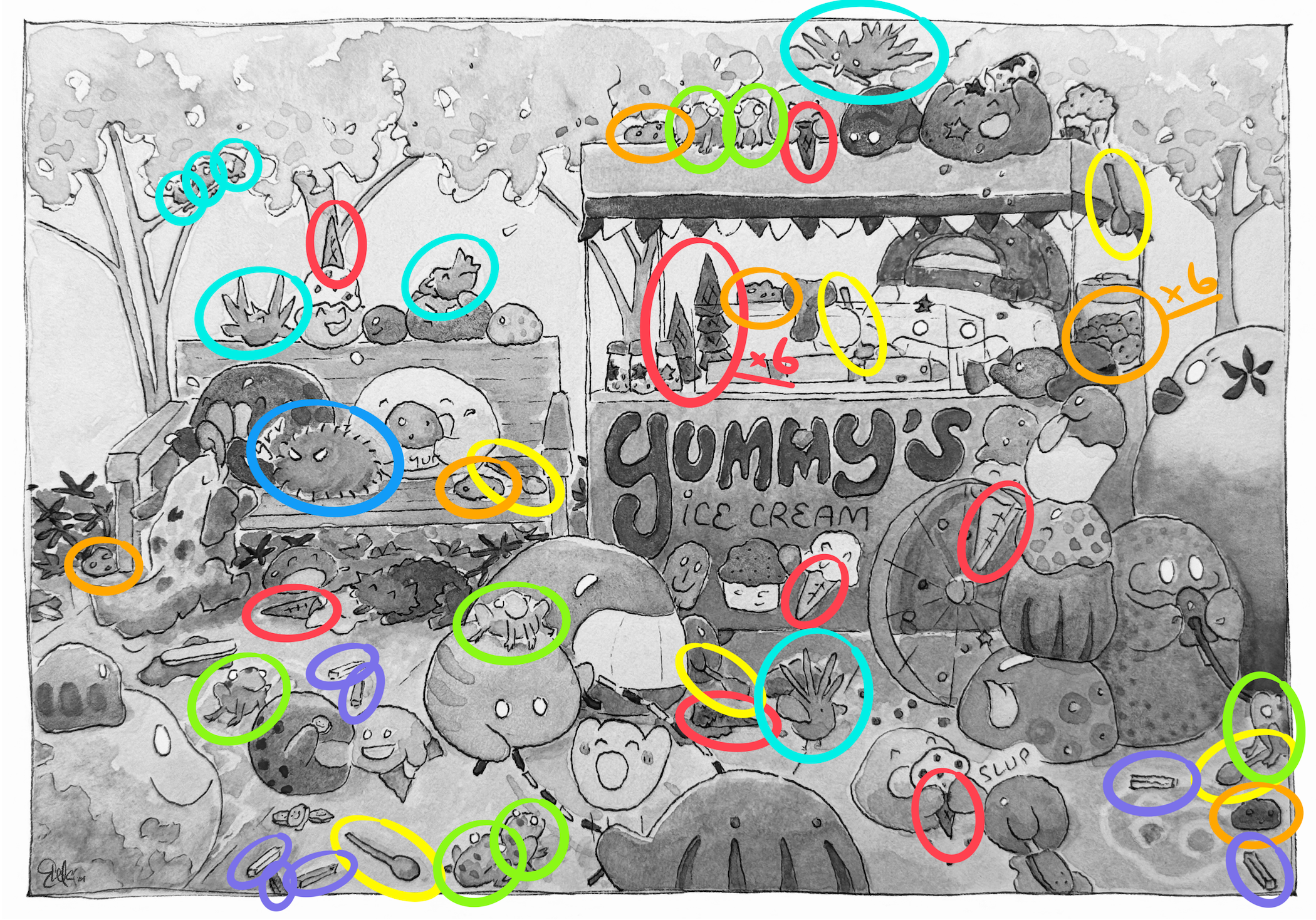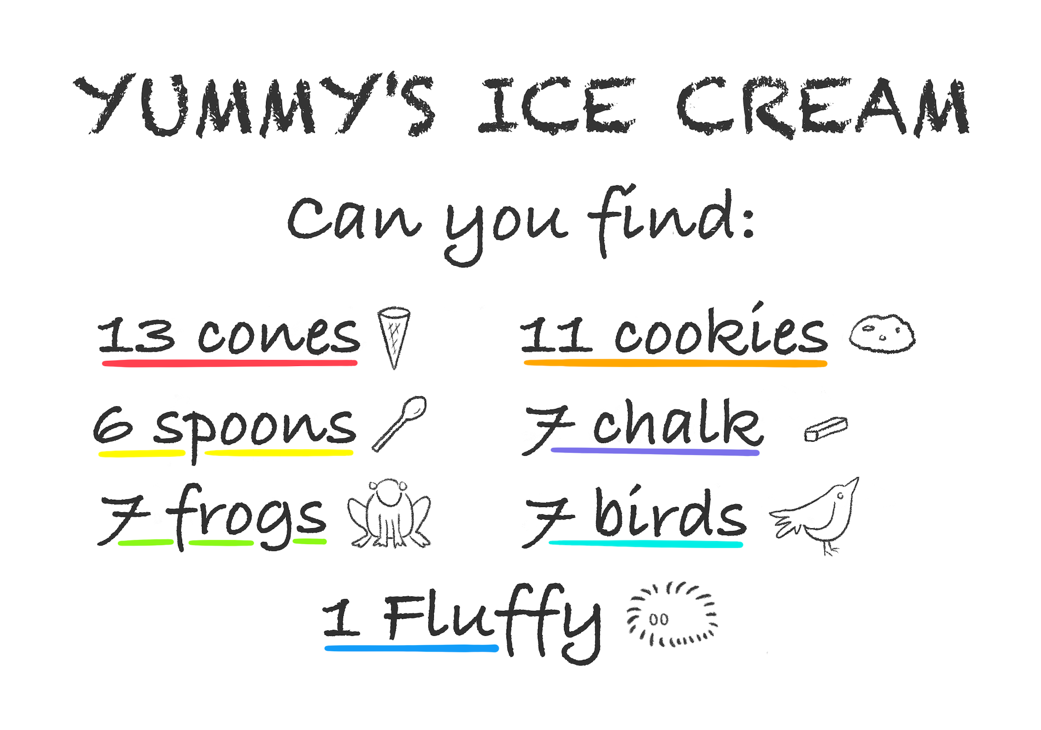Yummy loves scooping ice cream for everyone! Can you find all of the objects in this sunny day in the park?